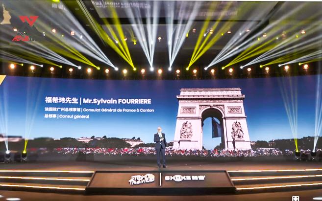 Shokz韶音大中华区负责人杨云、环法自行车赛主办方A.S.O.中国区负责人Sissi Li、法国驻广州总领事馆总领事Sylvain Fourriere 福希玮和经济领事Pascal Millard出席了出席本次品牌合作发布会并致辞。