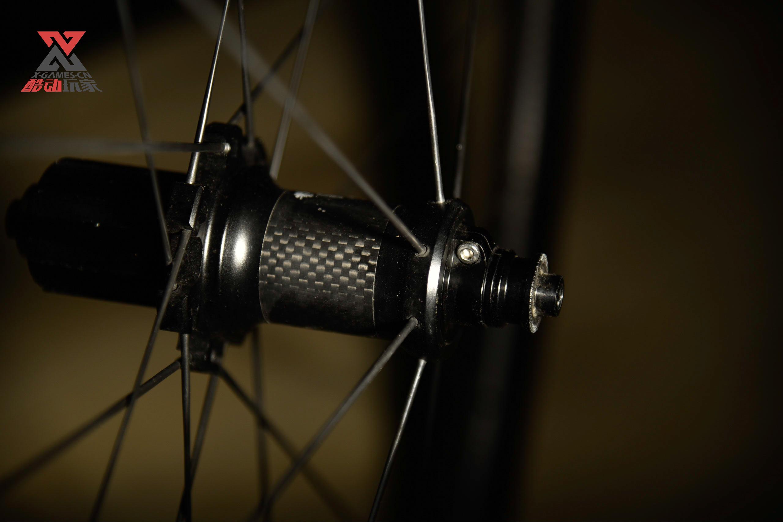 从箱子里拿出整个轮组的时候,拎在手中的感觉非常的轻,车圈表面的碳纤维纹路也很清晰。用手握住后轮的塔基用力转动后轮,也没有感觉到明显的离心偏摆。
