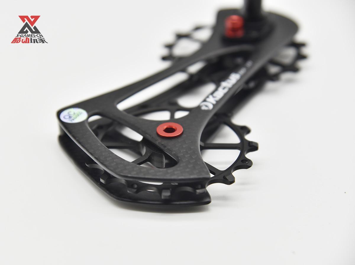 打开包装盒以后可以看见整个后拨导轮系统,采用了碳纤维支架。上下两片导轮均为17T,黑色的导轮和碳纤维支架同色,装车以后和整车比较也不会显得特别突兀。