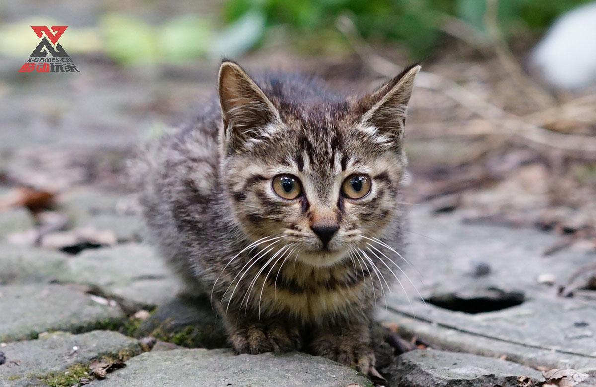 小奶猫在地面上的照片,注意和猫处于同一个焦平面的地面和和焦外的画面区别。焦外的虚化背景和焦点的景观过度画面,焦点前后的对比十分明显。