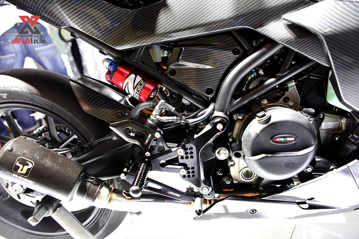 排气系统采用一款单筒型排气管,采取中位高度。在整体造型来看比较和谐,唯一让人担心的是这个角度是否会因为排气和刹车夹器距离过近,长时间使用后高温废气影响刹车夹器温度造成制动力衰退。